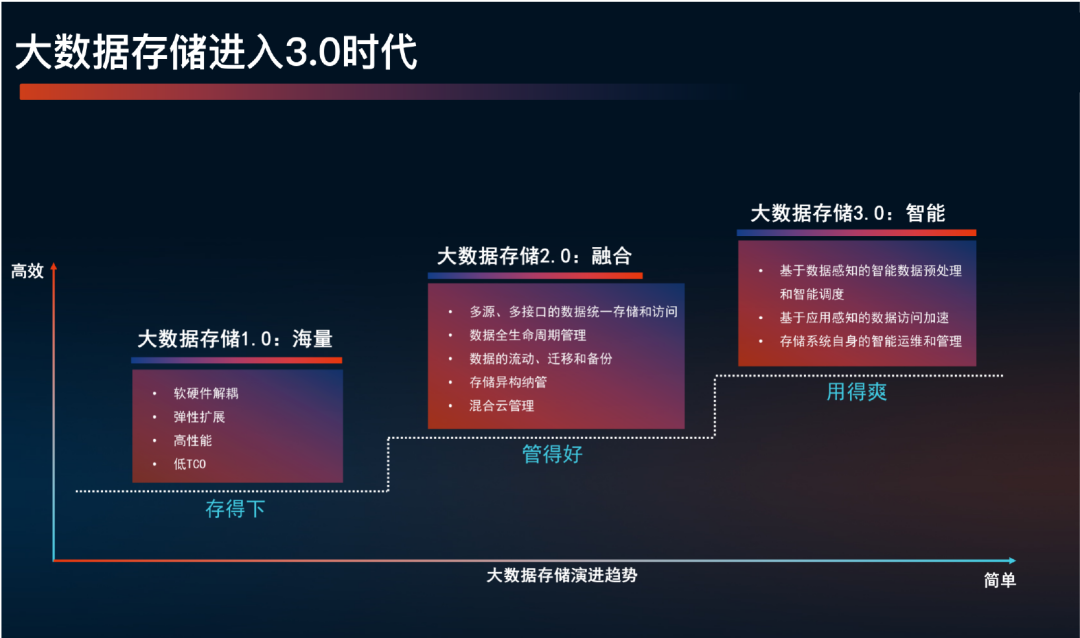 他表示大數(shù)據(jù)存儲發(fā)展從1.0時代到3.0的進化正呈現(xiàn)出產(chǎn)業(yè)化特征,1.0時代需要解決海量數(shù)據(jù)“存得下”的難題,