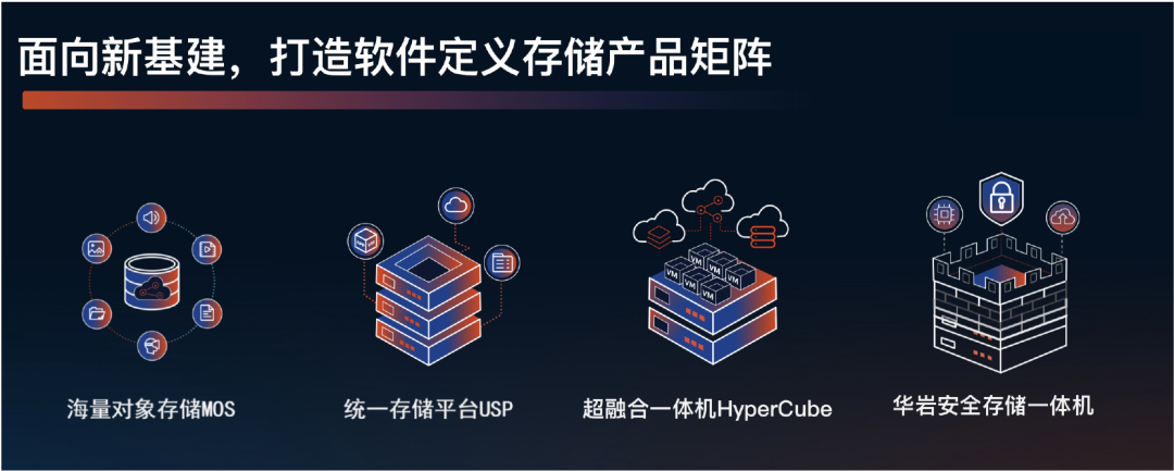 圍繞新基建和云構建大數(shù)據(jù)存儲產(chǎn)品矩陣,以四大產(chǎn)品線為核心,已覆蓋對象存儲SandStone MOS、