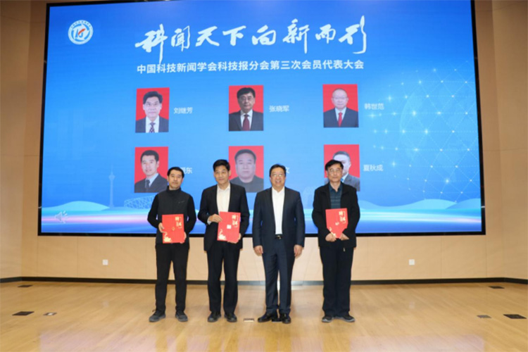 徐延豪為新當(dāng)選的中國科技新聞學(xué)會科技報(bào)分會會長郝建新頒發(fā)證書