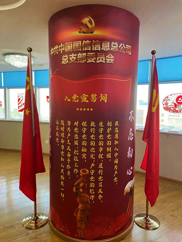 打開活動室大門,迎面是一個頂天立地的大圓柱,象征著中國共產(chǎn)黨在革命戰(zhàn)爭年代的中流砥柱作用。圓柱中心上方鐫刻著神圣的黨徽,黨徽下有“中共中國國信信息總公司總支部委員會”及熠熠生輝的入黨宣誓詞。兩側(cè)分別是“不忘初心 牢記使命”八個大字,誓詞下方是紅軍小號手塑像,寓意為總支全體黨員要遵守入黨誓言,聽從黨中央的號令,隨時隨地準備為黨和人民犧牲一切,永不叛黨。圓柱左側(cè)是黨組織架構(gòu)圖,有上級領(lǐng)導機關(guān):國家發(fā)展改革委黨組、國家信息中心黨委,下級四個基層支部。圖的上方是“學黨史 悟思想”六個醒目大字,下方是“國有企業(yè)要成為有核心競爭力的市場主體”的企業(yè)文化理論指導,其含義是要求各支部黨員在上級黨組織的堅強領(lǐng)導下,認真“學史明理、學史增信、學史崇德、學史力行”,明確發(fā)展目標,以黨建促發(fā)展。圓柱右側(cè),是毛澤東、周恩來等同志1948年離開陜北、東渡黃河的光輝形象,此處著重表達陜北從“落腳點”到“出發(fā)點”的戰(zhàn)略意義轉(zhuǎn)變,該圖上面寫著“辦實事 開新局”,其意義為,要求國信黨總支全體黨員本著“實事實干、干出實效”的精神,為企業(yè)提質(zhì)增效發(fā)展開創(chuàng)新的格局。