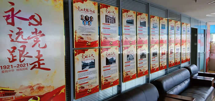 活動室左側(cè)玻璃墻,集中展示的是我黨在毛澤東、鄧小平、江澤民、胡錦濤和習近平等幾代領(lǐng)導人的帶領(lǐng)下走過的百年光輝歷程,系統(tǒng)地闡述了黨的“一大”到“十九大”的意義、背景、議題等內(nèi)容,便于全體黨員學黨史,知黨情,牢記“永遠跟黨走”的初心使命。