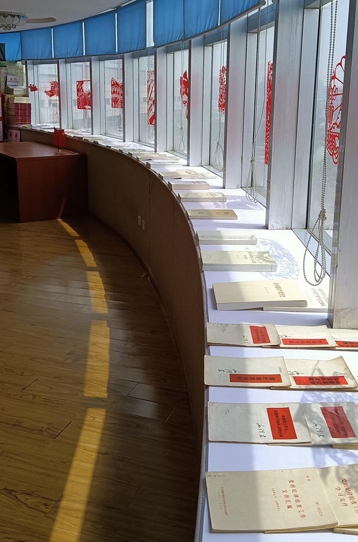 活動室右側(cè)是一整面的弧形鋼架窗,充足的光線使得室內(nèi)格外寬敞明亮。窗玻璃上分別貼著中國共產(chǎn)黨誕生的紅船、建立革命武裝的井岡山會師、紅軍翻越雪山、具有歷史轉(zhuǎn)折意義的遵義會議等紅色剪紙,連貫地展示了從建黨到建國的輝煌歷程。窗臺被修整成展示臺,陳列著黨在各個時期的黨史、黨建圖書,蘊涵著建黨100年來積累的思想、理念、認識、文化等精神財富。