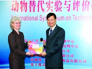 黃俊明所長(右)在廣東省疾控中心舉辦的國際毒理學(xué)動物替代實驗研討會上