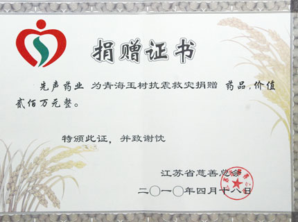 在青海玉樹地震面前,中華民族血濃于水的情感感染著每一個(gè)炎黃子孫,社會(huì)各界紛紛伸出了援助之手,為災(zāi)區(qū)人民提供力所能及的幫助。先聲藥業(yè)在得知發(fā)生地震的消息后,迅速行動(dòng)起來(lái),委托江蘇省慈善總會(huì),向青海省玉樹災(zāi)區(qū)捐贈(zèng)100萬(wàn)元救災(zāi)款及總價(jià)值200萬(wàn)元的藥品,用于救災(zāi)和受傷群眾的治療。先聲藥業(yè)此次捐贈(zèng)的藥品主要是用于治療感染、腦損傷、腹瀉以及抗炎鎮(zhèn)痛類的藥物,正是災(zāi)區(qū)治療受傷群眾所急需的藥物。