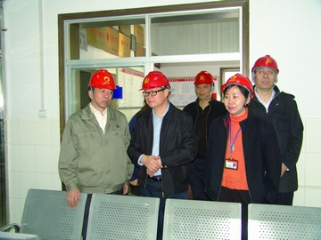 催化劑分公司總經(jīng)理、公司董事長談文芳(前排右一)、公司總經(jīng)理李國繁(前排左一)與公司黨委書記余立輝(后排右一)指導(dǎo)工作