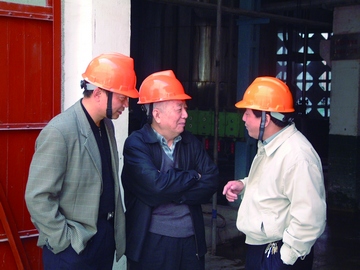 閔恩澤院士(中)與催化劑分公司副總經(jīng)濟(jì)師、公司董事曹平建(左一)親切交談