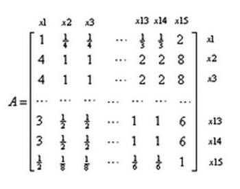 根據(jù)查閱相關(guān)資料以及前面的定性分析,通過兩兩比較,建立15個指標(biāo)的1—9標(biāo)度成對比較陣: