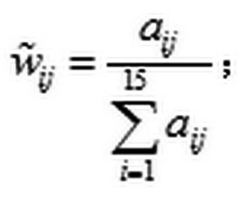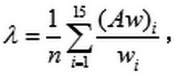 層次分析法中常見的計算權(quán)值方法有和法、根法、冪法和特征根法。在此,選取和法計算判斷矩陣中的特征值和特征向量。和法的原理是將判斷矩陣 列向量歸一化后的算術(shù)平均值,近似作為權(quán)重向量。計算步驟如下:
