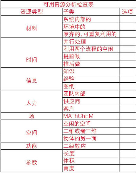 什么是資源呢?資源可以是任何東西,指系統(tǒng)或者它所處環(huán)境中包括的物質(zhì)、場(chǎng)或者它們的參數(shù)(包括時(shí)間和空間)。比如,如果我們要制造汽車(chē),所用到的資源就有發(fā)動(dòng)機(jī)、外殼、輪子等等;如果建樓房,所需要的資源就有鋼筋、混凝土、木材等等。這些所用到的材料就是資源。但我們這里指的資源并不是指常規(guī)意義上的看得見(jiàn)摸得著的以物質(zhì)形式存在的資源,而是指廣義的資源。資源是以任何形式存在的物體。我們可以將資源大致分為以下幾類(lèi):