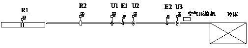 小型H型鋼車間軋區(qū)工藝平面布置如圖4所示。其中,R1、R2為粗軋機(jī),U1、U2、U3為精軋機(jī)組,E1、E2為軋邊機(jī)。本次軋輥的氣霧冷卻實驗在精軋機(jī)組的末架軋機(jī)上進(jìn)行,主要針對軋機(jī)上部的軋輥冷卻。氣霧冷卻中壓縮空氣由空氣壓縮機(jī)提供。