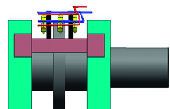 通過氣霧噴嘴的冷卻實驗研究及相關(guān)文獻(xiàn)檢索,噴嘴與輥面間距為150mm時可以獲得較好的冷卻效果。由計算可知,僅需在輥面軸線中點(diǎn)處布置一個噴嘴,氣霧覆蓋面即可覆蓋整個軸向輥面??紤]到R角與軋輥端面的冷卻,可在軋輥兩端正對著R角處各加一個噴嘴,即3個噴嘴為一組。由于小型H型鋼精軋機(jī)僅在工作輥上半部分存在多余空間以放置噴嘴,則以噴嘴噴出氣霧覆蓋工作輥的上半部分。氣霧裝置示意圖如圖5、圖6、圖7所示。