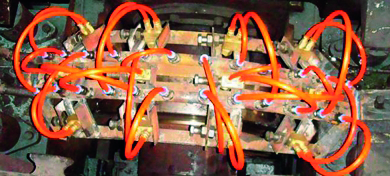 經(jīng)過計算,若要覆蓋工作輥的上半部分,至少需要4組噴嘴,沿著軋輥輥面均布在工作輥的上方。所示?,F(xiàn)場氣霧冷卻裝置如圖7所示。