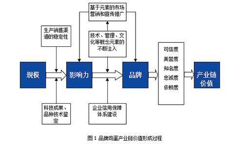 品牌雞蛋產(chǎn)業(yè)鏈是指從上游生產(chǎn)到中游加工流通再到下游銷售的各個環(huán)節(jié)主體對品牌雞蛋內(nèi)涵有一致的認知,共同圍繞著提升雞蛋的品牌價值和客戶的心理價值達成目標協(xié)同,以合理的契約為關系紐帶形成具有規(guī)模經(jīng)濟的分工體系,各主體基于統(tǒng)一的標準在各自的環(huán)節(jié)做優(yōu)特、求專精的產(chǎn)業(yè)鏈。品牌雞蛋產(chǎn)業(yè)鏈要求關聯(lián)主體都是有品牌的,所以它是集群的概念,不是產(chǎn)品或企業(yè)的概念。品牌雞蛋產(chǎn)業(yè)鏈價值形成過程如圖1所示。