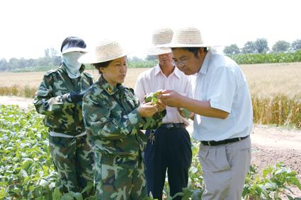 銀川大豆試驗站站長羅瑞萍(左二)和示范縣大豆專家調(diào)查大豆苗情況