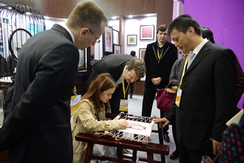 2015年4月,在第四屆中國蘇州文化創(chuàng)意設計產(chǎn)業(yè)交易博覽會創(chuàng)博會絲綢產(chǎn)業(yè)創(chuàng)新產(chǎn)品展區(qū),參觀者圍觀陸曉琳刺繡