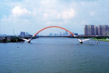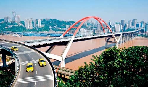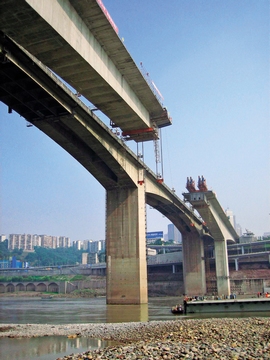 菜園壩長江大橋是重慶市區(qū)最重要的基礎(chǔ)設(shè)施建設(shè)工程。它連接兩個繁華的商業(yè)中心,其上層橋面設(shè)六線行車道及雙側(cè)人行道、下層橋面設(shè)雙線輕軌。大橋主橋為鋼混組合式系桿拱橋,主跨420米。
