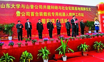 “山東大學(xué)控制科學(xué)與工程學(xué)院科研與社會(huì)實(shí)踐基地”揭牌儀式,左一為山普公司總經(jīng)理趙顯龍 ,右一為山東大學(xué)控制科學(xué)與工程學(xué)院副院長(zhǎng)李貽斌。