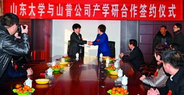 山普公司董事長(zhǎng)王淑慧(右)與山東大學(xué)控制科學(xué)與工程學(xué)院副院長(zhǎng)李貽斌(左)在產(chǎn)學(xué)研簽約儀式上