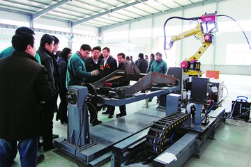 業(yè)內(nèi)專家們見證了山普公司首臺(tái)裝載機(jī)專用機(jī)器人焊接工作站的成立