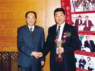 前農(nóng)業(yè)部副部長劉堅(jiān)(左)為陳林森頒“誠信企業(yè)家獎(jiǎng)”