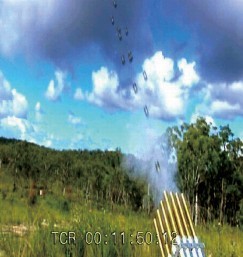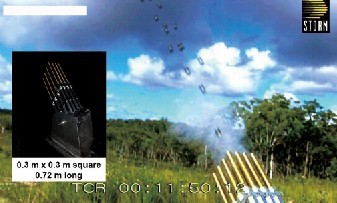 這項發(fā)明的另一個特色是,武器尾部帶著一個彈桶,它接收一系列推進(jìn)器形成一個格子和一個點(diǎn)火系統(tǒng),點(diǎn)火系統(tǒng)都對應(yīng)于格子,對推進(jìn)器中的每一個導(dǎo)火索進(jìn)行點(diǎn)燃。彈桶有一個入口部分,它在連續(xù)的子彈推進(jìn)器之間形成一種連動機(jī)制。發(fā)射系統(tǒng)也包括為每個推進(jìn)器安裝的一個感應(yīng)系統(tǒng)。