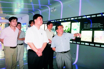 巨化集團(tuán)公司董事長(zhǎng)杜世源(右一)陪同省領(lǐng)導(dǎo)參觀巨化氟材料產(chǎn)業(yè)展示廳