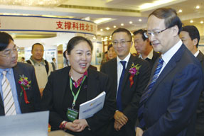 海淀區(qū)常務副區(qū)長楊志強(右)參觀中關村產(chǎn)學研合作洽談展區(qū)