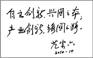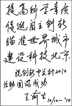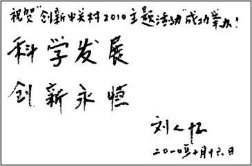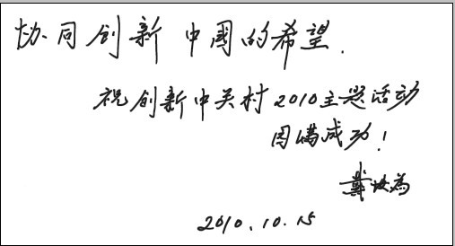 本刊總編輯、編委會主任劉人懷院士,本刊編委會主任戴汝為院士,本刊編委會副主任閔恩澤院士、范云六院士,本刊顧問、北京市科協(xié)副主席王渝生為“創(chuàng)新中關村2010主題活動”題詞