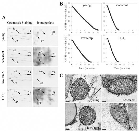 近年來,隨著蛋白質(zhì)組學的發(fā)展,雙向凝膠電泳及質(zhì)譜技術(shù)已經(jīng)逐漸滲透到果實采后生理病理學研究的各個方面。研究人員從活性氧代謝的角度,通過蛋白質(zhì)組學、蛋白免疫雜交以及其他生理生化分析,揭示了線粒體蛋白氧化損傷與果實成熟衰老的關(guān)系。研究發(fā)現(xiàn),包括線粒體外膜蛋白、三羧酸循環(huán)相關(guān)蛋白以及抗氧化酶在內(nèi)的線粒體蛋白在果實正常成熟衰老過程中發(fā)生了不同程度的氧化損傷。通過加速果實衰老和延緩衰老的方式,研究人員進一步從正反兩個方面開展了工作,并認為這些蛋白在果實成熟衰老過程中可能發(fā)揮重要作用。