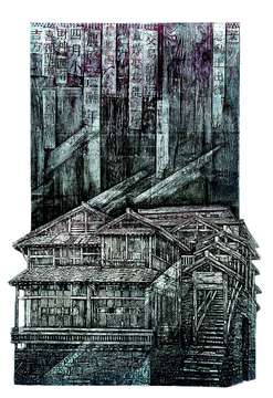 眾所周知,新興版畫和古代復(fù)制版畫不僅在制作技術(shù)上有很大差異,在藝術(shù)表現(xiàn)上也有所不同。而閻敏版畫卻是綜合版畫。閻敏老師自信地說道,我的綜合版畫有兩個(gè)特點(diǎn):一是運(yùn)用銅版—“凹版”加木版—“凸版”兩種技法混合應(yīng)用;二是各種不同媒介材料在制版中綜合運(yùn)用,即是將各種自然材料拼貼結(jié)合油畫做底子的方法制版,使得畫面中產(chǎn)生各種自然材料的肌理,產(chǎn)生一些偶然的、巧妙的色彩的層次感和畫面的新鮮感,使作品顯得厚重、豐富、耐看。例如我創(chuàng)作《民居》系列時(shí),針對江南民居木質(zhì)結(jié)構(gòu)、磚土沙石的特點(diǎn),用合適相配的各種材料作拼貼,使材質(zhì)感非常強(qiáng);創(chuàng)作《海風(fēng)》系列時(shí),直接用木皮做船,既逼真又自然,木紋肌理別致耐看,趣味無窮。由于使用了自然物做版,讓人欣賞作品時(shí)產(chǎn)生對生活的回味,對自然的聯(lián)想,對情感的追憶的獨(dú)特的審美感受。據(jù)我多年來從事綜合版畫的探索,我感到綜合版畫不僅僅是自由的組合,更是一種創(chuàng)新的思路。在各版種制作技法的組合運(yùn)用之外,還可以吸納更加多樣、復(fù)雜的材料與制作技術(shù),以拓展版畫本身的限制,從對版畫尋求新的的發(fā)展途徑看,這樣做有更加廣闊的前景。