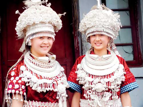 銀飾是民族服裝不可或缺的重要內(nèi)容。銀飾大致可分為頭飾、胸頸飾、手飾和衣飾。頭飾包括銀角、銀扇、銀冠、銀圍帕、銀發(fā)簪、銀插針、銀頂花、銀網(wǎng)鏈、銀花梳、銀耳環(huán);胸頸飾包括銀項圈、銀壓領(lǐng)、銀胸牌、銀胸吊飾;手飾衣飾包括銀手鐲、銀戒指,銀衣片、銀圍腰鏈、銀扣等。凱里灣水、凱棠一帶的苗族少女銀飾,通身可達(dá)五六公斤重。