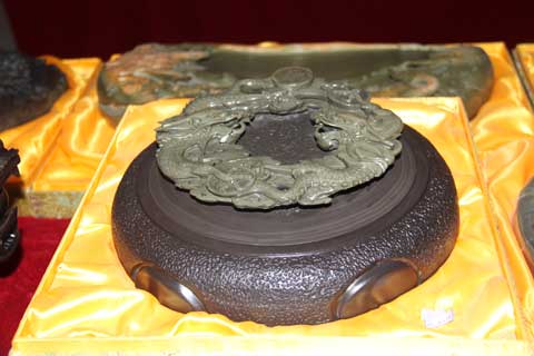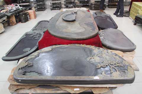 其二,要有好的工藝設(shè)計(jì)。設(shè)計(jì)的主要任務(wù)是根據(jù)石材的大小、形狀、花紋等,設(shè)計(jì)出作品的題材,以及主題、構(gòu)圖、布局。設(shè)計(jì)者要具備的基本素質(zhì)有如下幾個(gè)方面:深厚的文化底蘊(yùn)、超常的空間想象能力、獨(dú)到的審美能力、靈活機(jī)變的處置能力和巧妙的構(gòu)思構(gòu)圖能力。這樣才能做到以料構(gòu)思,因材施技,巧妙地利用石材上的石眼、色層和紋理,融天然與雕工于一體,制成精美的硯雕藝術(shù)品。我公司通過(guò)多年培訓(xùn),選拔培養(yǎng)了一大批高素質(zhì)的設(shè)計(jì)人材,設(shè)計(jì)出了較多的易硯名品精品。