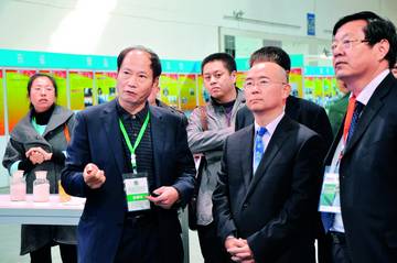 山東明晟化工董事長張波(前排左)向山東省環(huán)保廳廳長張波(前排中)介紹氨法脫硫工藝