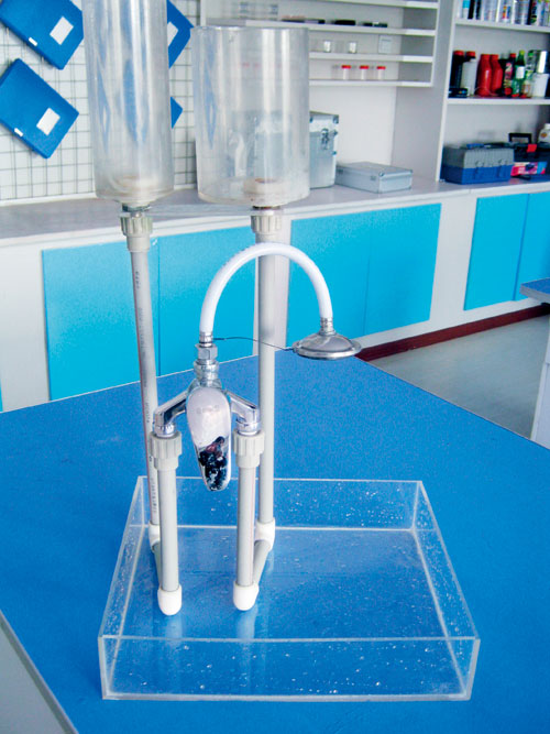 實驗過程中,通過對小彎管做進一步的改進,原本的設(shè)想是只留一個細出水管即可,用一只手調(diào)節(jié),另一只手試溫,但進一步的改進更加方便,使用者可在淋浴前僅用一只手就可完成全部的試溫調(diào)溫工作。