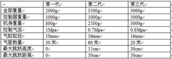 經(jīng)過測試修改最終制作出三代作品。第一代特性:重量輕,無法完成正常彈跳,機身硬度低,關(guān)節(jié)強度差,控制端氣量??;第二代特性:爆發(fā)力大,氣量足,能夠跳躍15cm高、50cm遠,缺點是由于機身和控制端分離,受氣管牽連,導致跳躍成功率較低;第三代產(chǎn)品是對第二代產(chǎn)品進行了改進,把控制端、儲氣罐、機身合為一體,并選用精度更高的合頁,其特性為:跳躍成功率高,機身整體強度高。三代產(chǎn)品具體參數(shù)如下表所示。