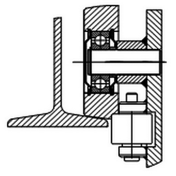 解決上述問題的另一方法是將導(dǎo)向輪部分嵌入小車墻板,這樣處理既可以調(diào)整與軌道翼緣側(cè)面間的距離,同時(shí)又可以使導(dǎo)向輪大徑避開車輪,從而縮小了兩導(dǎo)向輪之間的距離,進(jìn)一步減小轉(zhuǎn)彎半徑,一舉兩得,但小車的墻板設(shè)計(jì)會復(fù)雜一些。以上兩種方法可根據(jù)具體情況進(jìn)行選擇。嵌入墻板的導(dǎo)向輪見圖4。