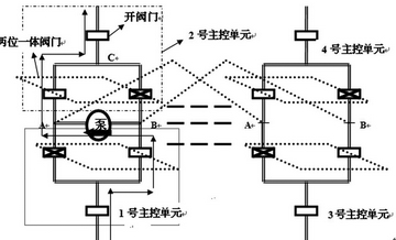 主控單元由電學(xué)中的“串、并聯(lián)”聯(lián)想到利用一個(gè)獨(dú)立開閉閥門與一個(gè)兩位一體閥門(導(dǎo)向閥門)的“串聯(lián)”組成一個(gè)主控單元,形成一個(gè)能夠?qū)崿F(xiàn)控制導(dǎo)流方向且可控制開閉的相對(duì)獨(dú)立的模塊。再通過對(duì)模塊(主控單元)進(jìn)行“并聯(lián)”可實(shí)現(xiàn)導(dǎo)流裝置的擴(kuò)展。圖2中的三條平行粗虛線表示了可以按照同樣的方式進(jìn)行多個(gè)的主控單元的“并聯(lián)”擴(kuò)展,以滿足不同程度的作業(yè)需求。