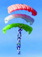這套飛機(jī)降落傘迫降系統(tǒng)的實(shí)施過程為:如果飛機(jī)出現(xiàn)故障無法正常在機(jī)場降落,飛機(jī)駕駛員應(yīng)先使飛機(jī)減速,也可于飛機(jī)尾部裝小阻力傘,情況緊急時(shí)打開小阻力傘,使飛機(jī)速度快速降下來后將其拋掉。在飛機(jī)開始失速降落時(shí),打開多層主承重傘及調(diào)控小傘,壓縮空氣將一排引導(dǎo)傘吹開,引導(dǎo)傘打開后,會拉開第一層傘。第一層傘打開約2.5秒鐘左右、承受一定的力量后,再將第二層傘拉出(注意第一層傘以后的開傘,傘繩應(yīng)在始終有阻力的情況下拉出,以保證上一層傘的形狀不變)。第二層傘承受一定的力量后,再將第三層傘拉出。
