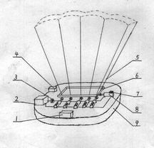 本人發(fā)明的是一整套載人飛機(jī)降落傘迫降系統(tǒng),它由如下幾個部分構(gòu)成:一套在迫降飛機(jī)將要失速下降時(shí)逐級打開的多級承重大傘;帶有自動拉傘繩機(jī)構(gòu)的調(diào)控小傘,與GPS控制系統(tǒng)連接,可調(diào)整飛機(jī)的平衡降落及通過GPS引導(dǎo)飛機(jī)自動落向平坦區(qū)域;由空氣阻尼器和減震彈簧組成的迫降緩沖器;一種蜂窩狀材料的緩沖座椅;一套在飛機(jī)落地前的急速拉傘繩機(jī)構(gòu)。