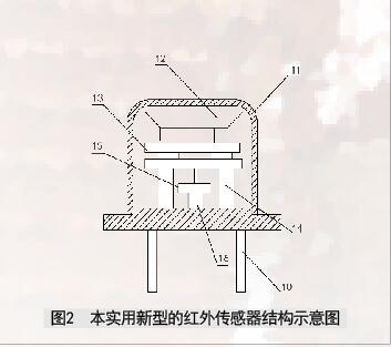 應(yīng)器箱體;2. 紅外傳感器;3. 發(fā)射器;4. 接收器;5. 傳感線;6. 報警器;7. 濾光片;8. 擴散器;9. 紅外感應(yīng)計數(shù)器;10. 引腳;11. 外殼;12. 敏感元件;13. PZT熱電元件;14. 支承環(huán);15. FET管;16. 電路元件。