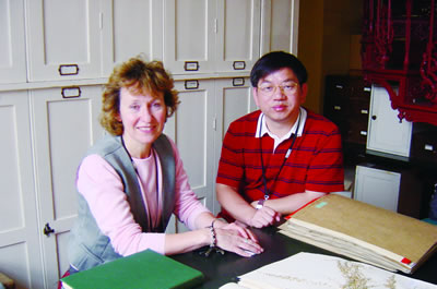 哈佛大學(xué)胡秀英教授在指導(dǎo)彭勇博士(左)進(jìn)行植物鑒定