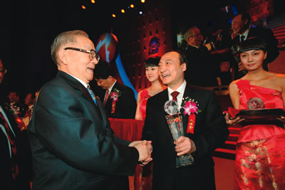 原中共中央政治局委員、國務(wù)委員兼國防部長遲浩田為岳成律師頒發(fā)“2005年度中國十大誠信英才”獎