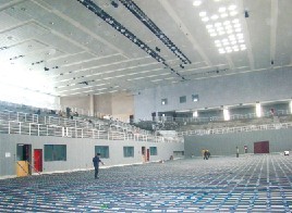館內(nèi)另一個(gè)亮點(diǎn)是螺栓球鋼網(wǎng)架結(jié)構(gòu)。北科大體育館的屋面鋼結(jié)構(gòu)采用的就是螺栓球鋼網(wǎng)架結(jié)構(gòu)。俯瞰整個(gè)屋面,就像是由許多桿件組成的一張“網(wǎng)”,而連接桿件的節(jié)點(diǎn)是球形的,上面有小孔用來(lái)擰入桿件上的螺栓,桿件通過(guò)這些節(jié)點(diǎn)連接在一起,組成了鋼網(wǎng)架。據(jù)介紹,出于經(jīng)濟(jì)性考慮,屋面選用的螺栓球鋼網(wǎng)架結(jié)構(gòu)是一種比較成熟的技術(shù)。盡管如此,為了解決體育館的賽后利用問(wèn)題,準(zhǔn)備將來(lái)在體育館內(nèi)還要建一個(gè)游泳館??紤]到螺栓球在游泳館的水霧環(huán)境下會(huì)出現(xiàn)問(wèn)題,在研究水霧、濕氣對(duì)螺栓球節(jié)點(diǎn)產(chǎn)生的影響后,提出切實(shí)可靠的防腐防銹措施,即對(duì)構(gòu)成螺栓球鋼網(wǎng)架中的螺栓球采用噴鋅防銹工藝,保證在任何情況下,保持螺栓球的設(shè)計(jì)要求,并保證螺栓球的正常使用年限。