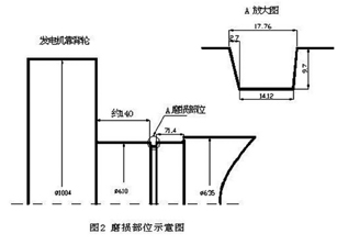 2010年9月25日小修時,經(jīng)解體#6瓦軸承蓋,發(fā)現(xiàn)汽輪機低壓轉(zhuǎn)子和發(fā)電機轉(zhuǎn)子連接對輪罩殼左側(cè)水平位置固定的螺栓斷裂,前側(cè)底部支撐螺栓彎曲,后側(cè)底部支撐螺栓斷裂,汽輪機低壓轉(zhuǎn)子和發(fā)電機轉(zhuǎn)子連接對輪罩殼上部兩端基本與頂部轉(zhuǎn)子接觸。解體對輪罩殼后,發(fā)現(xiàn)發(fā)電機轉(zhuǎn)子距離對輪140mm處嚴重磨損,受損部位產(chǎn)生一上口寬為17.76mm、槽底寬為14.12 mm、深度為9.70 mm的梯形槽(見圖2);發(fā)電機轉(zhuǎn)子受損處設(shè)計直徑為610 mm,材質(zhì)為25Cr2Ni4MoV。對發(fā)電機磨損部位進行著色探傷,未發(fā)現(xiàn)表面裂紋,對發(fā)電機磨損部位兩邊做硬度檢查,硬度值為HB216-225。