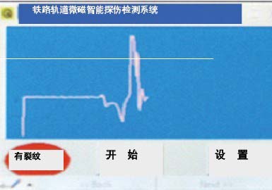2007年5月起,本系統(tǒng)在天津工務段京滬線標準軌和可動心軌提速道岔(尖軌、長短心軌、翼軌)特殊部位以及鋼軌焊縫接頭等處進行了試用。實際檢測操作時,使用者只需手推檢測小車在軌道上行走(也可手持探頭直接在軌道上劃行或提離小段高度)即可,系統(tǒng)能自動采集數(shù)據(jù),并經(jīng)內部一系列運算,隨即可在顯示屏上直接顯示出該截面的檢測結果,若有裂紋等缺陷,則除可在屏幕顯示“有裂紋”或其他缺陷外,蜂鳴器還會同時發(fā)出報警聲音,以提醒使用者注意,如照片4、5所示。