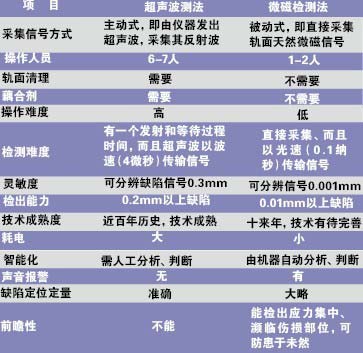 在試用中,由于該系統(tǒng)靈敏度高,檢出裂紋等缺陷可靠,操作方便,需1至2人操作(而超聲波法需6-7人),而且,不需要清理軌件表面、不需要施加耦合劑,工效高,適于軌道探傷實際工作需要,受到探傷人員歡迎。試用實踐證明,本系統(tǒng)可用于可動心軌提速道岔的探傷檢測,解決了這一技術難題,填補了空白。同時,也可用于常規(guī)探傷或焊縫探傷,而且,與傳統(tǒng)的超聲波方法相比,微磁檢測技術逐步突顯出許多優(yōu)勢(詳見兩種探傷方式對比表)。