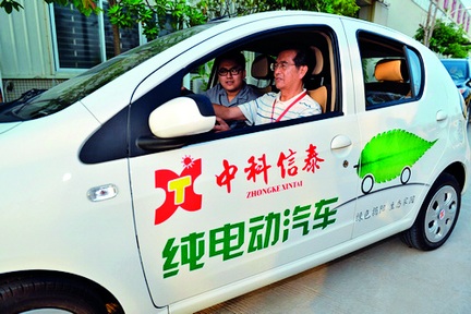 廣東中科信泰新能源公司著力發(fā)展新能源汽車產(chǎn)業(yè),填補了粵東地區(qū)“純電動轎車”生產(chǎn)領(lǐng)域空白。圖為俄羅斯工程學(xué)院外籍院士、華南理工大學(xué)原校長、教授劉煥彬饒有興致地試開了該公司生產(chǎn)的純電動轎車,親身體驗駕駛感受。