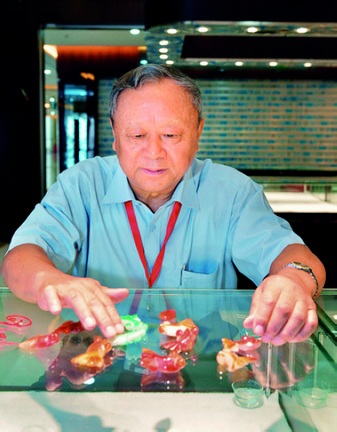 在粵工作院士休養(yǎng)考察團一行參觀了揭陽的陽美玉都,詳細了解陽美翡翠玉雕的發(fā)展歷程以及玉器產(chǎn)業(yè)發(fā)展情況,并認真察看了部分翡翠玉雕作品。圖為魚類生理學(xué)專家林浩然院士對玉石做的“魚”很感興趣,一口氣買下了10條。