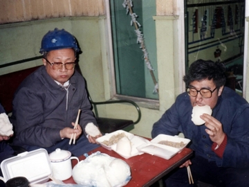 秦裕琨院士(左)深夜在黃島電廠現(xiàn)場(chǎng)參加新燃燒器調(diào)試后用餐