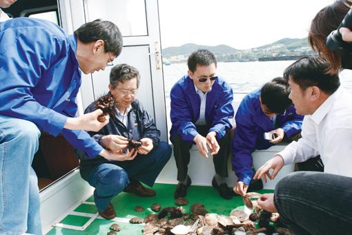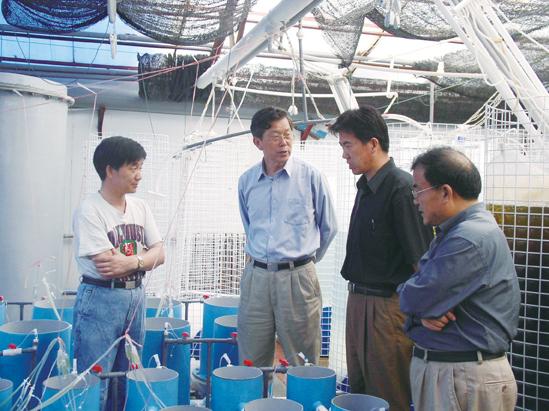 唐啟升院士(左二)與科研人員在現(xiàn)場討論貝類育苗設(shè)施實(shí)驗情況